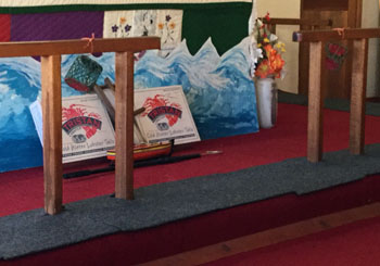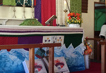 | Photos show: Above: Father Denzall with the newly presented model longboat alongside his wife Sinyati and Lay Minister Carlene Glass-Green Right: Fishing gear adorned the aisle during the special service. Below: Tristan Lobster cases and a sea frieze in front of the altar. |