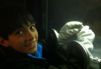 | Visiting Kensington Museums: Left: At the Natural History Museum Above: Using Space Gloves at the Science Museum |