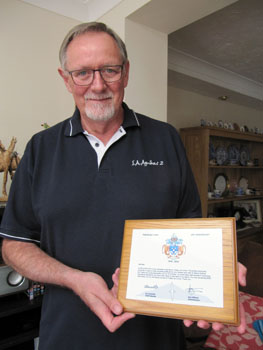 | Alex first visited the Association's President and Chairman Michael Swales at his Staffordshire home to present him with a plaque recognising over 60 years tireless support to the Tristan da Cunha community. | Alex then continued to the Norfolk home of Association Secretary Jim Kerr to present him with a plaque recognising his decades of work for the Tristan community, principally in the field of education. |