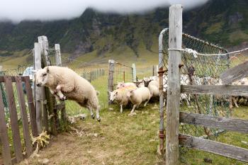 | Men sorting sheep in the pens, while lamb makes a bid for freedom. | |