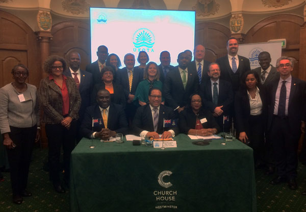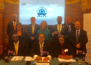 | UKOTA Political Council gets underway, Cayman Islands premier presiding. Ian Lavarello is front left. | UKOTA leaders - Ian Lavarello is second from the right. |