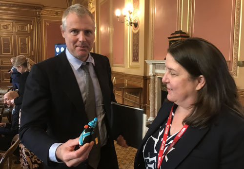 Stephanie presenting another penguin to Lord Zac Goldsmith!