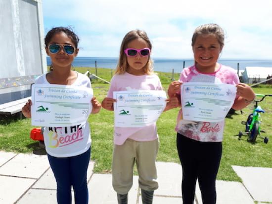 Children in Class 1 and 2 receiving their certificates for swimming 20m |