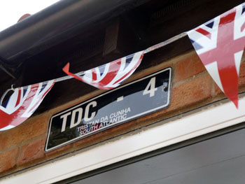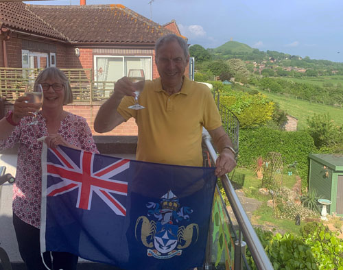Celebrations in Norfolk: Above: Ann and Alan Ashworth fly the Tristan flag Right: Bunting and their Tristan registration plate Below: Ann and Alan |