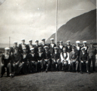 The full HMS Atlantic Isle Company with Rev Lawrence and Lieutenant Commander Corfield directly below the flagpole. Charles Toseland is standing 4th from the right. |