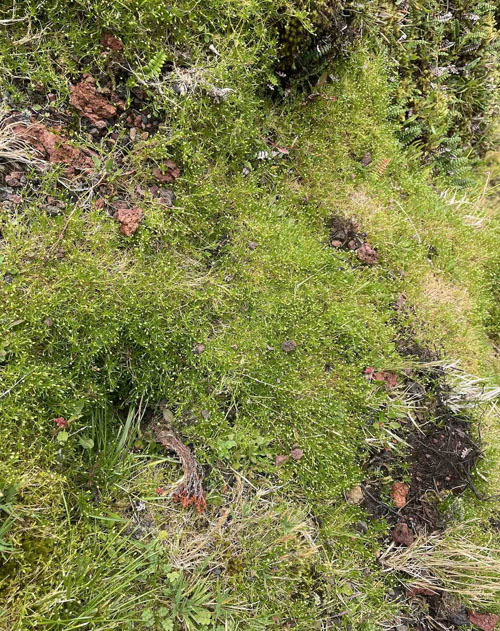 While searching for Starchies (Tristan Thrushes), Peter Ryan came across large areas of Procumbent Pearlwort (Sagina procumbens) near the Castles between 1150 and 1300 m on the lower slopes of Tristan’s peak. Subsequently it was also found east of Hottentot Gulch at a similar elevation. This invasive species is commonly found in stony areas on the coastal lowlands of Tristan, with large areas at The Caves particularly badly affected. However, to date it has not been reported from the island’s interior. It’s presence on the Peak is particularly worrying, because the Pearlwort is an aggressive invader of loose scoria, and so has the potential to radically change the vegetation of the peak. Sadly there’s little that can be done to prevent its spread. A massive effort to eradicate the plant on Gough Island, where it was introduced at the weather station in the late 1990s, was finally abandoned, with efforts now focusing on containing it to the sea cliffs in the immediate vicinity of the base. The fact that the Pearlwort has reached the peak on Tristan again raises concern about the possibility of it getting into the highlands of Gough, where it would likely have a much greater impact than in the lowlands. It also highlights the need for effective biosecurity measures even when moving around within as well as between islands.