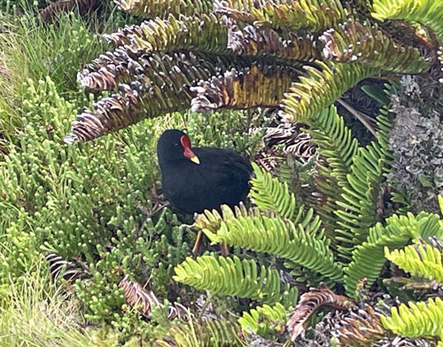 A Gough Moorhen peers out from under a bogfern on the Base above Burntwood