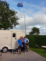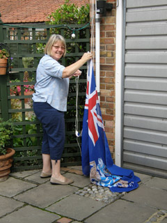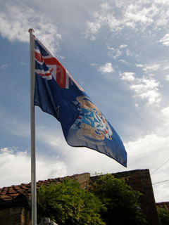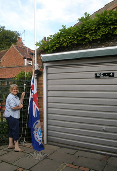 In recent years the mid-winter Anniversary Day celebrations are fairly low-key. In 2011 a public holiday followed on Monday 15th August when many families took advantage of a mid-week day off to tend their potato patches. Nevertheless, stalwart Tristan Association member Ann Ashworth from Norfolk was determined to fly the Tristan flag from her Wells-next-the Sea home on 14th August. Ann won the flag in a competition when she again visited Tristan aboard RMS St Helena earlier in 2011 and will return to celebrate Christmas with island friends John and Vanessa Lavarello when cruising to 'Tristan da Cunha and Beyond' aboard MS Island Sky later this year. Ann's photographs below show her and the flag on Anniversary Day 2011. The photo left shows the Tristan flag flying outside the Tristan Admin Building. |
