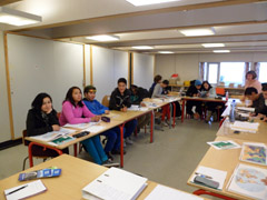 Staff at the Mathias Storch School -- where the children are pupils in Ilulissat -- thought that perhaps a slightly older group with a more advanced knowledge of English might benefit, so invited Julie to visit and give a lesson about Tristan to students in Class 10A, who at age 15, have good working English -- even if their school atlases did not show Tristan, but just a wide expanse of the South Atlantic! Julie said: "Greenland has some of the world's most remote communities and there are no roads or railways connecting settlements on an island which is the largest in the world that is not a continent -- an area around half the size of Europe. We talked about what it's like to live and work on somewhere even more remote -- Tristan, how people earn their living and the livestock they're allowed to keep. I left a copy of Rockhopper Copper with the class and presented a plaque of Tristan's coat of arms to the school. You can imagine that a group of fifteen 15-year-olds were rather lively --their English was very good and it was great fun making Tristan a little better known in a fascinating part of the world". (* Julie was travelling at her own expense and at the conclusion of the conference, she and Chris went on to a holiday further north on the remote island of Uummannaq, off Greenland's North West Coast). |