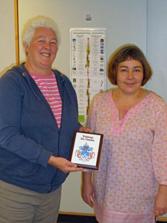 Julie Bates (left) presents the plaque of Tristan's Coat of Arms to teacher Mette Petersen. |