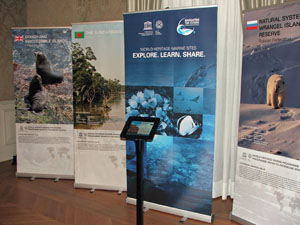 Display boards at the IMPAC3 Congress in Marseilles on 23rd October 2013Showing Left the Gough and Inaccessible Islands World Heritage Site Far Right: The UNESCO World Heritage Committee logo |