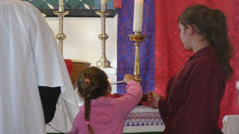 Owen Glass in the arms of his Godparent Natalie Swain and next to his father Simon during the service. |