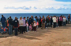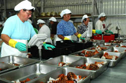 Left : The fish processing factory situated above Calshot Harbour and linked by Puma Road Right: All hands - Many Islanders have full-time or part-time employment in the factory which is the mainstay of the local economy. |