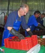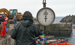 Bringing Home the Crawfish Larry and Chris Swain watch closely as their catch of valuable Tristan Rock Lobster is unloaded ready for weighing on the fifth fishing day of the season on 17th August 2007. Report and pictures of August fishing from Tristan Administrator Mike Hentley. |