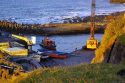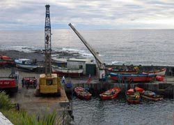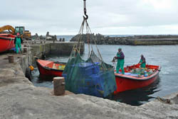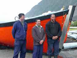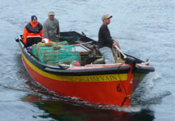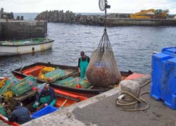 Father and son team of Herbert and Clive Glass in the Tristan Calshot Harbour after a September 2005 Fishing Day Above : sorting a lobster catch - Right : unloading by cargo net |