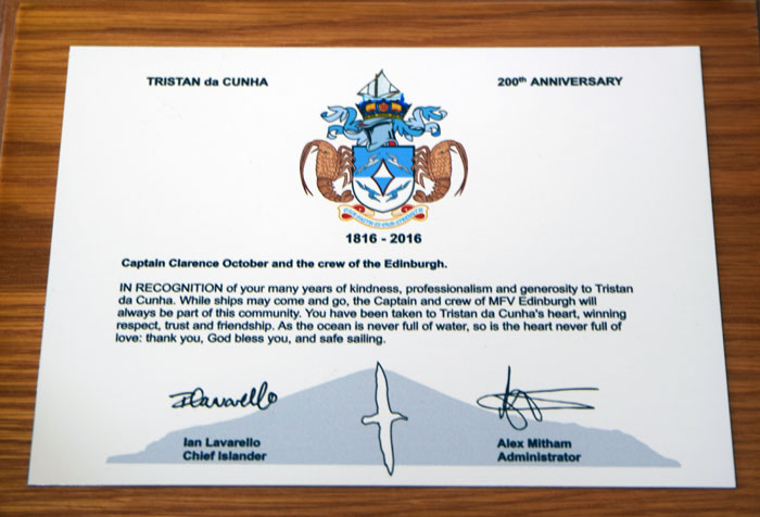 On the 15th September 2016, The Chief Islander Ian Lavarello, Conrad Glass and I went across to the MV Edinburgh to present a plaque to Captain Clarence and the crew of the Edinburgh. To mark the 200th Anniversary, the community felt it was only fitting to show their appreciation for all the years of tireless support the crew has given to Tristan da Cunha. From their ongoing assistance to the community, medevac transfers, their skilled rescue of the Oliva crew, their support on marine conservation matters, to their obvious (and renowned) fishing expertise, Captain Clarence and the crew have shown unbelievable kindness and generosity to Tristan over so many years. They are firmly a part of the remotest inhabited community in the world. On a personal note it has not only been an honour to sail with the Edinburgh, but a privilege to witness the professionalism, dedication and commitment of the crew. As the plaque states - As the ocean is never full of water, so is the heart never full of love; thank you, god bless and safe sailing. |