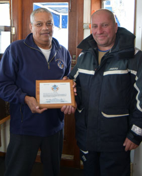 | Photos show: Above: Captain Clarence with Alex Mitham on the bridge of MV Edinburgh; Right: Chief Islander Ian Lavarello presenting Captain Clarence with the plaque; Below: The plaque. |