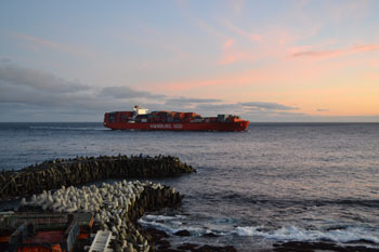 | The container ship MV San Clemente diverted to Tristan on the 18th July 2015 to pick up the island’s UK Representative, Chris Carnegy. 18-Jul-2015 |