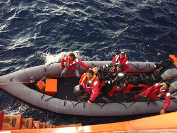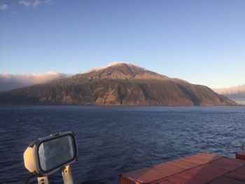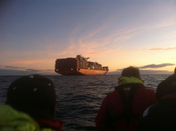 Above: The Tristan RIB returning from San Clemente after safely transporting Chris to the ship to begin his journey back to the UK. Right: San Clemente departing with Chris safely aboard. |