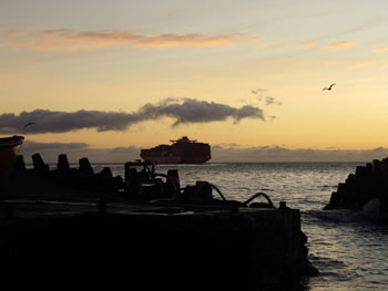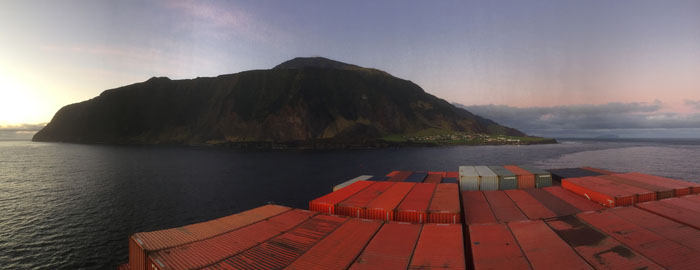 The passage took just over a week, slightly delayed by a backlog in Durban. But I’d been fretting about the three-month gap in Tristan’s shipping schedule, so it was still a huge advance on that. Hamburg Sud is one of those freight lines that actively encourages passengers (though normally ones who join at a large port!), and they take a fair number on some routes, notably from Germany to South America. After my unexpected journey, I’d highly recommend a container-ship voyage as one of life’s travel experiences. And I found that the chance to sail close to Tristan and see the settlement had been a treat for San Clemente’s crew as well – until now they’d only glimpsed the island from afar. My heartfelt thanks go to Captain Yankov and all the crew who came to my aid. |