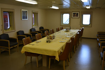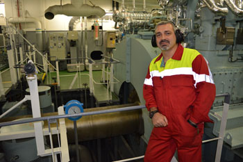 I soon fell into that timeless routine that goes with a long sea passage; well fed in the officers’ mess, well-read thanks to my Kindle, and square-eyed from all the DVDs. I caught up on my BBC work and my volunteer duties for Tristan. And a real treat was the chance to get some exercise: walking the length of the ship, and pedalling furiously on the exercise bike in the gym. The crew were kind, professional and very patient with all my questions as I tried to learn more about the ship and its work. Chief engineer Hristo Altaparmakov showed me around his engine room; a cathedral of steel with nine vast pistons propelling us eastwards at up to 21kt. |