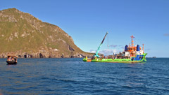 As for the wreck itself, the owners/insurers sent out a survey vessel (The Fairmount Fuji) over Christmas. There were teams from Titan (who were here for the oil rig removal), LOC (London Offshore Consultants), ADUS (Advanced Underwater Surveys) and Seaview Systems. They were here for two weeks and were joined by a small island team (James Glass, Jeremy Green, Warren Glass, Simon Glass and Wayne Swain) who participated fully in the survey and provided vital local knowledge. The teams made a survey of the area with sonar equipment and Remotely Operated Underwater Vehicles. We have not yet seen their report but they located both the fore and aft sections of the wreck and also looked for evidence of soya. It appears that the wreck continues to break up and we understand they found no evidence of soya on the seabed. Our concern remains whether there is still oil, other lubes and soya still trapped inside the wreck and soya rotting in the deeper water where it has settled. We hope this survey will give us some clarity on these important issues. |