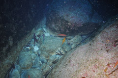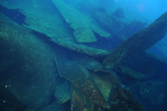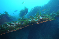 Six months after the wreck, diving surveys near the remains of the cargo section found almost no urchins in an area where they were previously abundant. Mass smothering by the large quantities of soya spilled in the weeks following the wreck is suspected. In the absence of grazing urchins, large numbers of kelp sporelings had settled on rocks and on the wreck, making it difficult to detect any alien species that may have arrived with the ship. Few adult lobsters were seen. A site dived off southeast Stoltenhoff appeared normal, with abundant urchins. A large middle section of the ship was not found. |