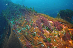 Other photos show the fast growth of Tristan seaweeds on the wreck after only six months.