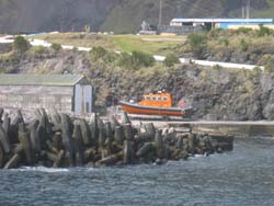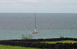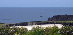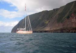 Dreams Fulfilled for American Yacht SY Nine of Cups called on Tristan between 5-7th December 2006. Nine of Cups is named after a Tarot card signifying 'dreams fulfilled', is crewed by David & Marrie Lynn of Denver, Colorado, USA and is en route from Uruguay to Cape Town. Photograph from Janice Hentley shows the boat anchored off the 1961 lava flow taken from the Residency garden over a hedge of summer hydrangeas, an upturned Tristan longboat and a goalpost on the American Fence school playing field. |