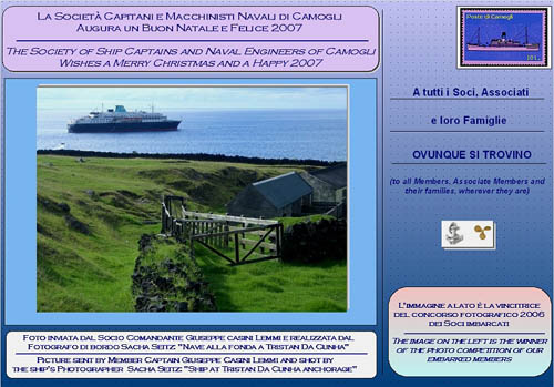 Season Greetings postcard which shows a picture of Tristan da Cunha. This image won the 1st prize in the Photo Contest (see www.scmncamogli.org) held by the Society of Ship Captains and Naval Engineers based in Camogli in Italy.