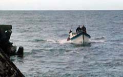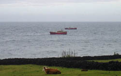 November Fishing Ship Arrivals Shown left is a picture of the MFVs Jade (foreground) and Espadarte in the anchorage off the Tristan Settlement. Both vessels arrived on Sunday 19th November to complete formalities before beginning their fishing trips. The Espadarte is a regular visitor and has renewed a longline licence for fin fish. The Jade is a newcomer and has taken out an experimental licence to catch octopus off the seamounts in the Tristan EEZ. Tristan Crawfishing activities can be viewed on the Fishing News and Fishing Page in the Tristan Economy section. |