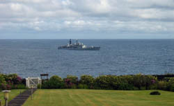 HMS Edinburgh arrived at the Tristan da Cunha Settlement of Edinburgh on Thursday 30th November from Cape Town for a two day visit. The ship carried Chief Islander Anne Green and her husband Joseph who otherwise would not be home for Christmas (The next scheduled ship leaves Cape Town on 18th January). Details of the ship's visit can be found on our Community News Page. Photo from janice Hentley shows HMS Edinburgh from The Residency Garden on 30th November - St Andrew's Day. |