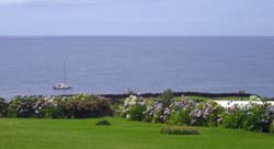 Yacht Tryer Visit A 34' sailing yacht called on it's way from Brazil to Cape Town visiting Tristan on 21st - 23rd December 2005. Skipper Dick Jaeger (Netherlands), and crew members Fabiano Ponto (Brazil) & Georg Rodler (Germany) were able to come ashore on each of the three days they spent at the anchorage.The yacht is shown right at anchor photographed from The Residency lawn with its mid-summer Hydrangeas. |