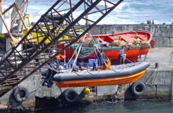 The picture left shows the RIB being launched to undertake an emergency fuel supply run. Cha-Lee's crew are reported to be in good spirits (buoyed by South Africa's rugby world cup win) and are being treated to traditional Tristan hospitality. Photographs and report from Tristan Administrator David Morley (with additional notes from Claire Volkwyn) and updated on 28th October. The incident illustrates why visiting yacht crews are not allowed ashore overnight as conditions change so rapidly around the island. Only small flat-bottomed craft (like the RIB shown left) can navigate the shallow Calshot Harbour, so yachts cannot seek a safe haven there. |