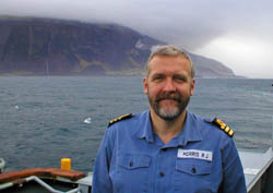 Photo Left: Left to Right: Commander of the HMS Southampton Richard Morris, Tristan Administrator David Morley, Father Chris Brown Photo Right: Commander Richard Morris on board HMS Southampton with cliffs, Settlement and 1961 lava flow in the background |