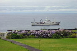 The two vessels arrived at Tristan on Sunday the 16th September, however bad weather conditions prevented any contact until Tuesday the 18 September. The vessels were called in to make leeway and the small police rib coxed by Mark Swain and crewed by Trevor Glass and Rodney Green (accompanied by divers Simon and James Glass) proceeded to the vessel. James and Trevor boarded the vessel three miles off the settlement to check the vessel's papers and directed the vessel around the corner to the lee of the island, as there was a heavy swell running on the settlement anchorage. The anchorage at the Rookery was found not to be perfect, but it was the only possible place on the day, and we knew according to the weather forecast that conditions would be bad again tomorrow. After anchoring the Hemeferio Sul, the rib returned to the Settlement to collect the diving gear, and proceeded back to the Alcyon. The Captain showed us pictures on the computer of the trawl net that was caught in the propeller, and reported that yesterday a large amount had come loose from the propeller. The divers tipped off the Wave Dancer for a look, although cautious of the heavy swell and surge from the vessel, being on a towline from the Hemeferio Sul on anchor. Simon dropped down behind the vessel and found that there was no net left attached to the propeller, the comments from the captain was that it was possible that it had chaffed through during towing, and had come off the day before. However, the Chief Engineer reported that there was still a very bad vibration on the main engine, when he increased over a certain speed, and suspected that damage had been done to the shaft or prop when the net went into the propeller. The only solution now was for the vessel to head for dry dock in Cape Town or Uruguay, nine to fourteen days away respectively. The fishing logbooks were in order and the freezers were found to be holding Swordfish, Tuna, Sharks, etc. The rib then returned to the settlement around 4:30pm and the vessels departed. Photographs and Report from James Glass |