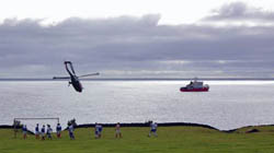 Left : Helicopter from HMS Southampton landing on the American Fence field with the 1961 lava flow and a cloudy Big Point in the background. Right: They went that way! |