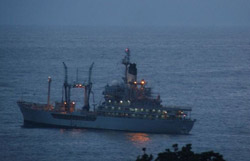 Professor Molchanov's final visit Regular cruise ship visitor Professor Molchanov made what is believed to be her last visit to Tristan da Cunha 9-11 April 2010. Arriving in bad weather on Friday 9th, it wasn't until Sunday 11th that the harbour could be used, but in weather that prevented any passengers landing. This was the final cruise ship visit of a most disappointing 2009-10 summer season The Professor was photographed right on 10th April by David Morley. See also a report on the ship's visit by Dawn Repetto on the separate Cruise Ship Visits Page. |