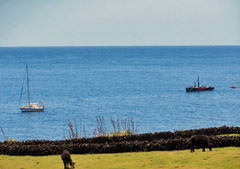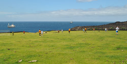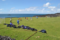RFA's visit gives Tristan Tigers Pictures from Sean Burns show left the 7510 tonne RFA Black Rover at anchor and right the Tristan Tigers football team on their way to a 9-0 win over the ship's football team. |