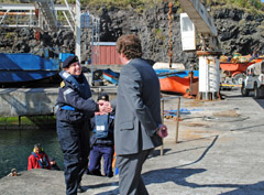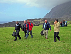 HMS Clyde visited Tristan for the first time on 28 th October en route from the Falkland Islands to Simon’s Town in South Africa. It was a good day with glorious weather. The first barge went off to the ship at 9am and bought ashore her Captain, Lt Cdr Catherine Jordan RN and the first party of crew members. At 10.30am a party of ship’s crew were invited to join the ceremony of unveiling the plaque at the top of the 1961 volcano to commemorate the 50 th anniversary of the October eruption. Administrator Sean Burns welcomed HMS Clyde’s crew, introduced the event and also read out a message from Peter Wheeler who was the Administrator on the island at the time of the eruption. (See full text on our 50th Anniversary 1961-3 Book Page). The Captain (Lt Cdr Catherine Jordan) also made a speech. This event was followed by a lunch at The Residency hosted by Administrator Sean Burns and his wife Marina and attended by crew members, expatriates working on Tristan and Island Councillors and their partners. Other crew members took part in a guided tour of the 1961 volcano, organised by Tina and Iris and led by Joseph and played a round of golf organised by Simon Glass. At 1.45pm the first crew party returned to the ship to relieve the others who came ashore for a game of football and stretch their legs with another guided hike. The football match was arranged between a joint island/ship's team and a ship's team. The joint Islanders – Crew team won 3-2 with Shane Green scoring at least two (possibly three goals!). Unfortunately Tristan Tigers have yet to play an away fixture! After the football match everyone returned to the Post Office and Tourism Centre where refreshments were served. The crew from HMS Clyde presented the island football team with a plaque of appreciation. The museum and Post Office were open with Lillie, Natasha, Iris, Tina and Paula all helping. Sammy and Lorraine made sure they received their unique immigration stamps. In the end neither the Albatross Bar or cafe were opened as planned as the crew were 'dry' on this ship as they were on stand-by (hence they could only come ashore in two defined groups). Duncan, Colin, Clifton and John, who helped man the barge (assisted by Stan and Jack ashore), set some traps and were able to give the ship a special send-off treat of some Tristan lobster! At 5pm all were at the harbour to go back to the ship following a successful and enjoyable first visit. |