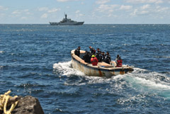 Close encounter with Queen Mary 2 Picture left taken by QM2 passenger David Cox from the deck looking down on the fisheries patrol vessel as it drew alongside to exchange gifts. We give further details of this and a message from Captain Paul Wright on our separate Cruise Ship Page |