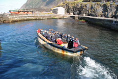 | Delayed July MV Edinburgh trip The fishing vessel MV Edinburgh usually makes six return voyages from Cape Town to Tristan da Cunha. In the fishing season these are extended to enable the ship to fish the outer islands. From April - July they are return passenger (capacity 12) and freight services. The June / July trip was scheduled to arrive on Tristan on 5th July and return to Cape Town on 12th July. In the event the ship arrived on 7th July but poor weather prevented cargo being unloaded until 13th July and left for it's return trip to Cape Town only on 20th July. Katrine Herrian was one of the unfortunate passengers who spent 12 days aboard MV Edinburgh, five on them holed up in Tristan's lee as gales blew around the harbour. She got ashore on Monday 12th July. This is a stark reminder to would-be visitors to Tristan to ensure they have flexible travel arrangements! |