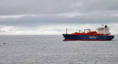Left: The Government Barge Atlantic Wave heads out to the Baltic Trader with MV Edinburgh also at anchor to the right. |