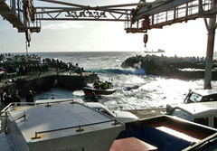 Photos above from Maxime show the RIB being launched in Calshot Harbour and the view from the RIB as it approached the Faroe Islands based tug. Our report of the vessel's February visit resulted in many visits from Faroese visitors to www.tristandc.com and we welcome them back as they may be interested in the vessel's help to Tristan da Cunha now. |