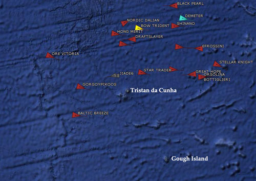 Tristan Government Offices may be officially closed until Monday 11th January, but as often happens, Head of Communications Andy Repetto was at his desk and discovered, via his ship tracker link, that no less than 25 ships were passing in nearby waters on 27th December 2015. The image above shows the positions of 20 vessels at 07.06 GMT on 28th December 2015, 16 of them named on the image, and all within 500kms of Tristan. Nevertheless there was no contact with any of the vessels. |
