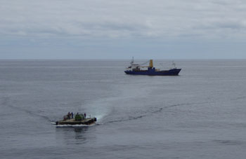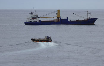 RFA Gold Rover made a similar drugs drop on 16th December 2007 after a flu outbreak on Tristan da Cunha. The photo above was taken by Claire Volkwyn of Gold Rover off Tristan on that day. |