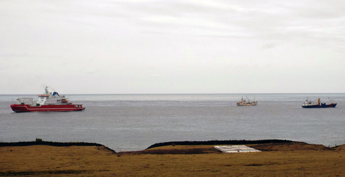 All three scheduled ships at Tristan da Cunha SA Agulhas II (left), MV Edinburgh (centre) and MV Baltic Trader anchored off Tristan on 29th September 2015 Photo: Shirley Squibb |
