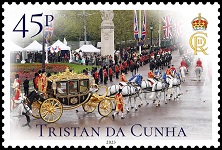 £3 Souvenir Sheetlet - King Charles III holds the Sovereign's Sceptre with Cross and the Sovereign's Sceptre with the Dove during his Coronation ceremony. PA Images / Alamy. The background shows the largest military procession since the 1953 Coronation of Queen Elizabeth II, making its way down The Mall towards Buckingham Palace following the Coronation. MB Media Solutions/Alamy.