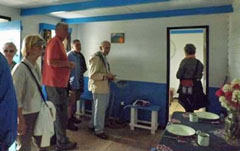 Right: Visitors tour the Traditional Thatched House Museum with Tristan Association Chairman and President Michael Swales centre in the white jacket. Michael made his first visit to Tristan da Cunha with the Gough Island Scientific Survey in 1955 when all the island homes were thatched.