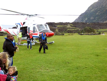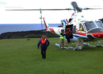Dawn's photos above show passengers safely Photo below shows a welcoming party for arriving passengers and right a load of passenger's luggage being lifted ashore by helicopter. |